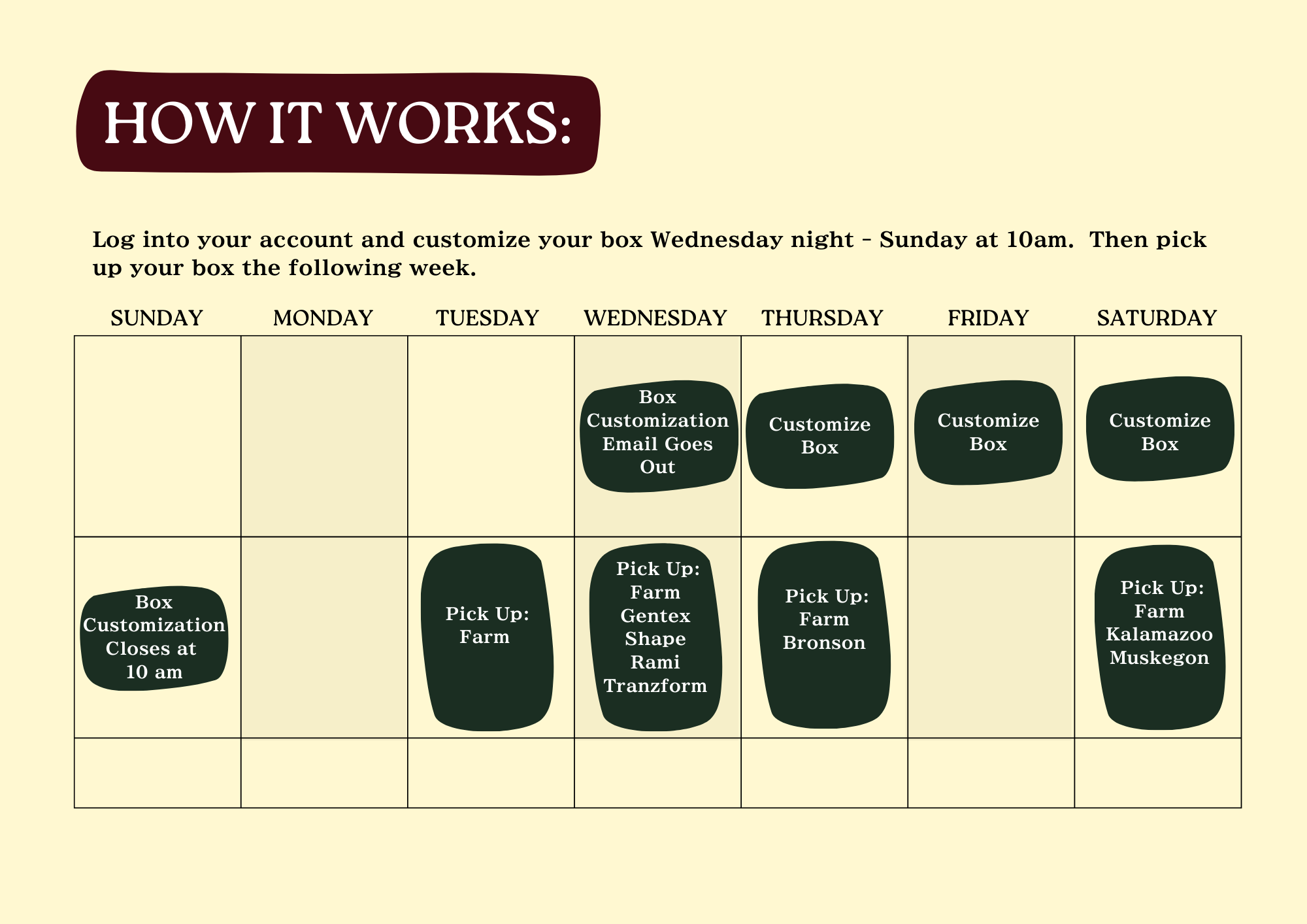 On Wednesday night, the week before your scheduled delivery, you will receive an email from the farm. The email will have listed what we have planned for your box. The original boxes listed in your email will be $22 – $23 each week. From the email you will be able to log into your account and make changes to your box. Here is a helpful how to video with more info on how to make changes.